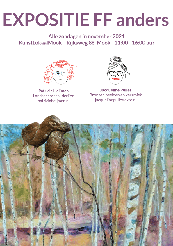 De natuur en in het bijzonder de Mookerheide is voor beide kunstenaars een grote inspiratiebron en dat is ook wat hen verbindt in deze expositie. Beiden rennen regelmatig in de mooie omgeving rondom Nijmegen en omstreken en nemen dan al de indrukken -en in het geval van Jacqueline zelfs materiaal- mee naar het atelier en geven er in hun werk een net iets andere draai aan. Net FF anders dus!
